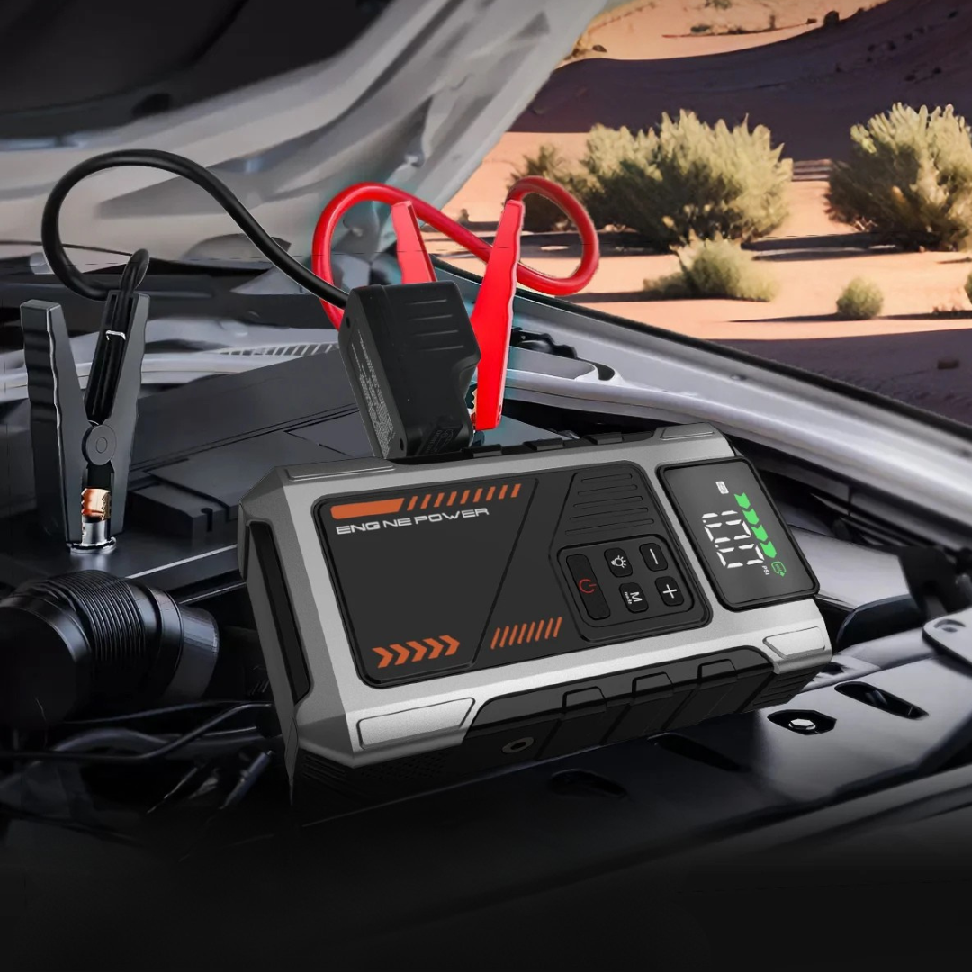 jump starter + kompresor + powerbank + latarka LED, przeznaczone do pojazdów 12V.